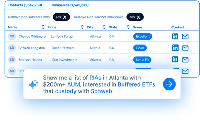 Reach decision-makers across RIAs, family offices, and more with verified titles, emails, and phone numbers at scale.