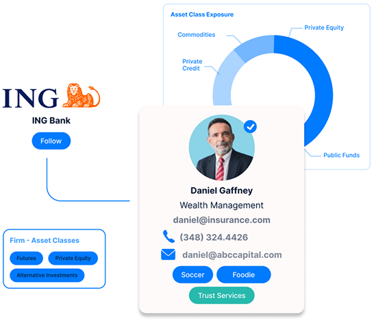 Whether it's ETF holdings, tech stack, TAMP affiliation, hobbies, team structure, or niche focus areas we surface the intel that helps you personalize every message, meeting, and move.