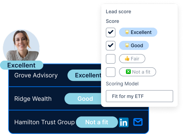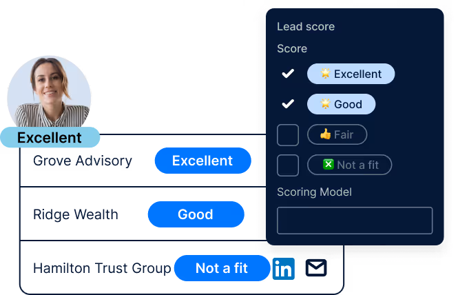 Automatically score advisors and firms using location, AUM, custodian, keyword tags, and site visit activity to prioritize best-fit leads.