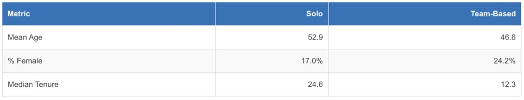 Solo vs. Team-Based Advisor Age, Gender, & Tenure Comparison