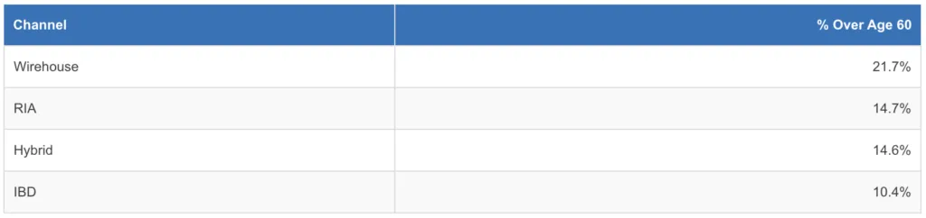 - More than 1 in 7 advisors is over age 60, with succession risk especially high in solo RIAs and wirehouses