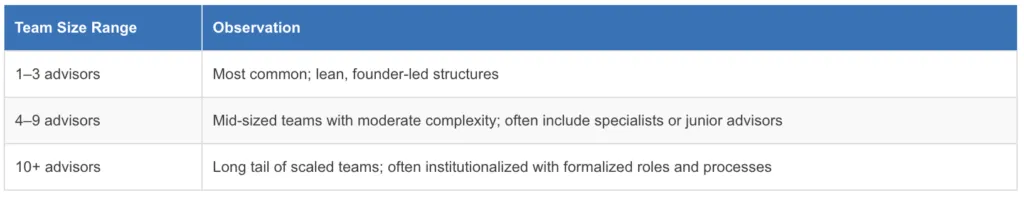 - The average team remains lean (2.8 advisors), but a long tail of scaled firms is reshaping service models