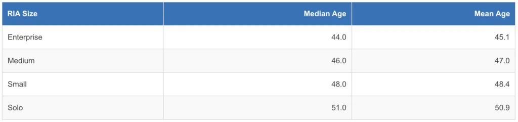 Key Insights: Solo RIAs are significantly older than enterprise firms, highlighting succession opportunities and book acquisition potential.