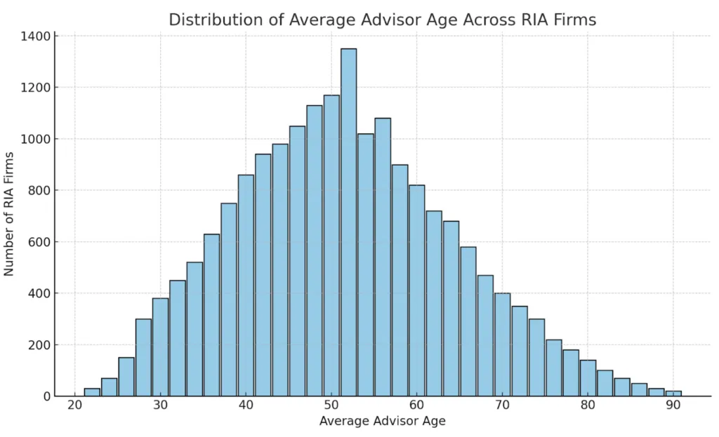 The average U.S. advisor is 46.7 years old, with a median age of 46. Notably, 14.4% of advisors are over 60, indicating a significant cohort approaching retirement.