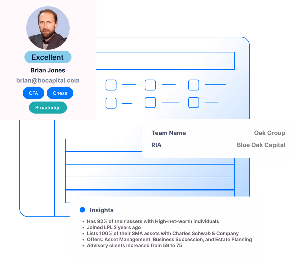 Our platform connects data from SEC filings, BD records, RIA structures, custodian relationships, team hierarchies, and verified contact information. You get a complete view of each advisor and their firm in one place, without sorting through stale or incomplete profiles.