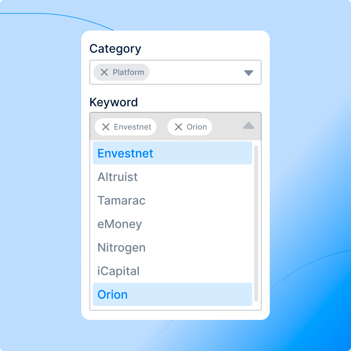 Explore the tech stacks of thousands of RIAs - from portfolio management and planning tools to CRMs, and TAMPs - with comprehensive coverage across the advisor technology landscape to identify ideal platform fits and uncover competitor footprints.