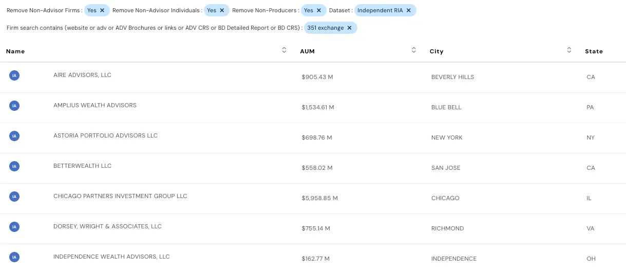 - Filter and target RIAs participating in or facilitating 351 exchanges