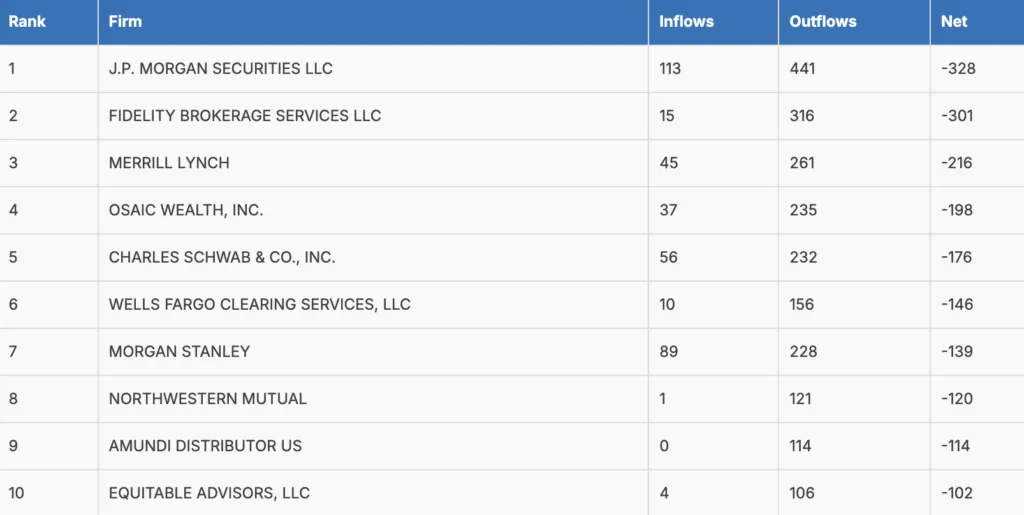 - J.P. Morgan Securities posted the highest outflows for a second straight month, likely tied to structural segmentation changes and retention challenges at the Private Wealth level.