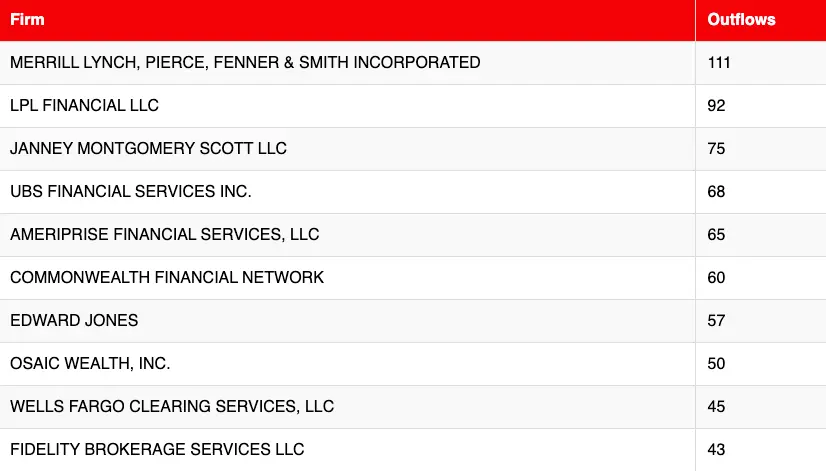 - Merrill Lynch Pierce Fenner and Smith Incorporated with 111 advisor departures