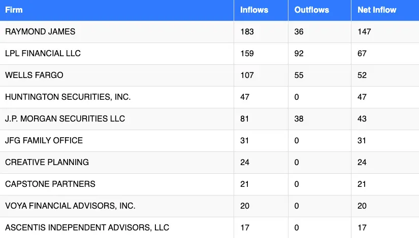 When viewed through a net inflow lens, Raymond James and LPL Financial still posted positive advisor growth despite appearing on both hiring and departure lists. Wells Fargo and Huntington Securities also showed positive net movement, while several wirehouse firms continued to experience net advisor losses.