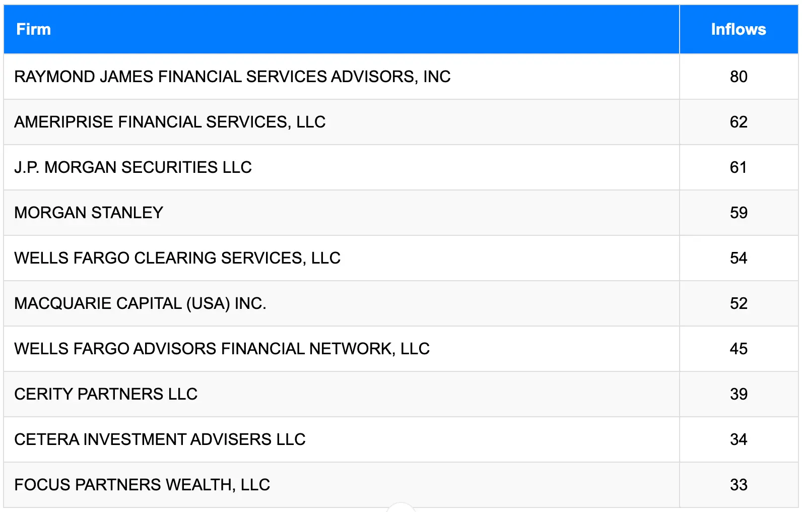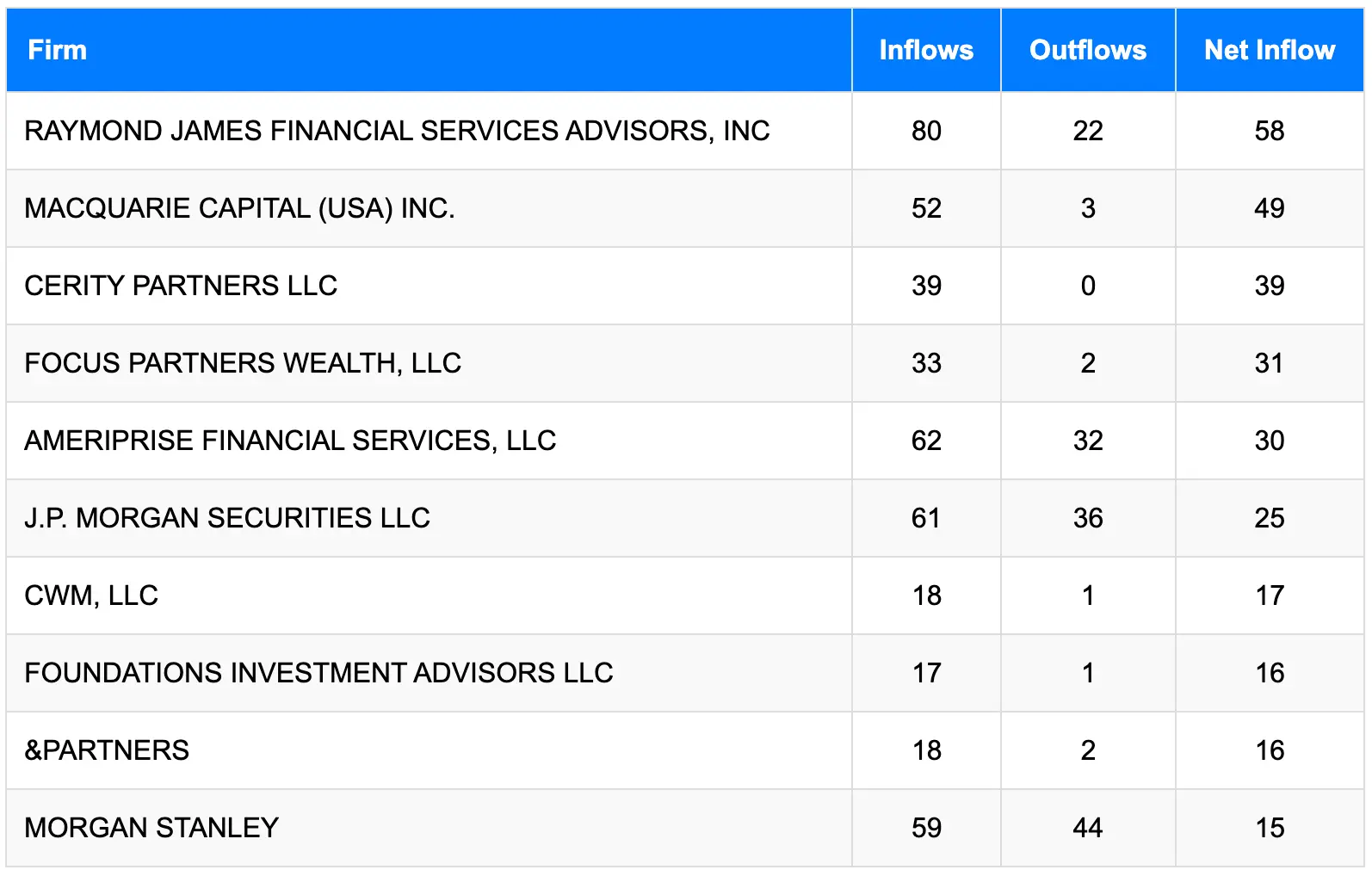 LPL Financial’s recent acquisition of Commonwealth Financial Network also influenced overall movement patterns this month. To ensure cleaner comparisons, we did not include LPL inflows or outflows in this month’s rankings, and Commonwealth’s transition activity was also excluded while integration continues across both firms.
