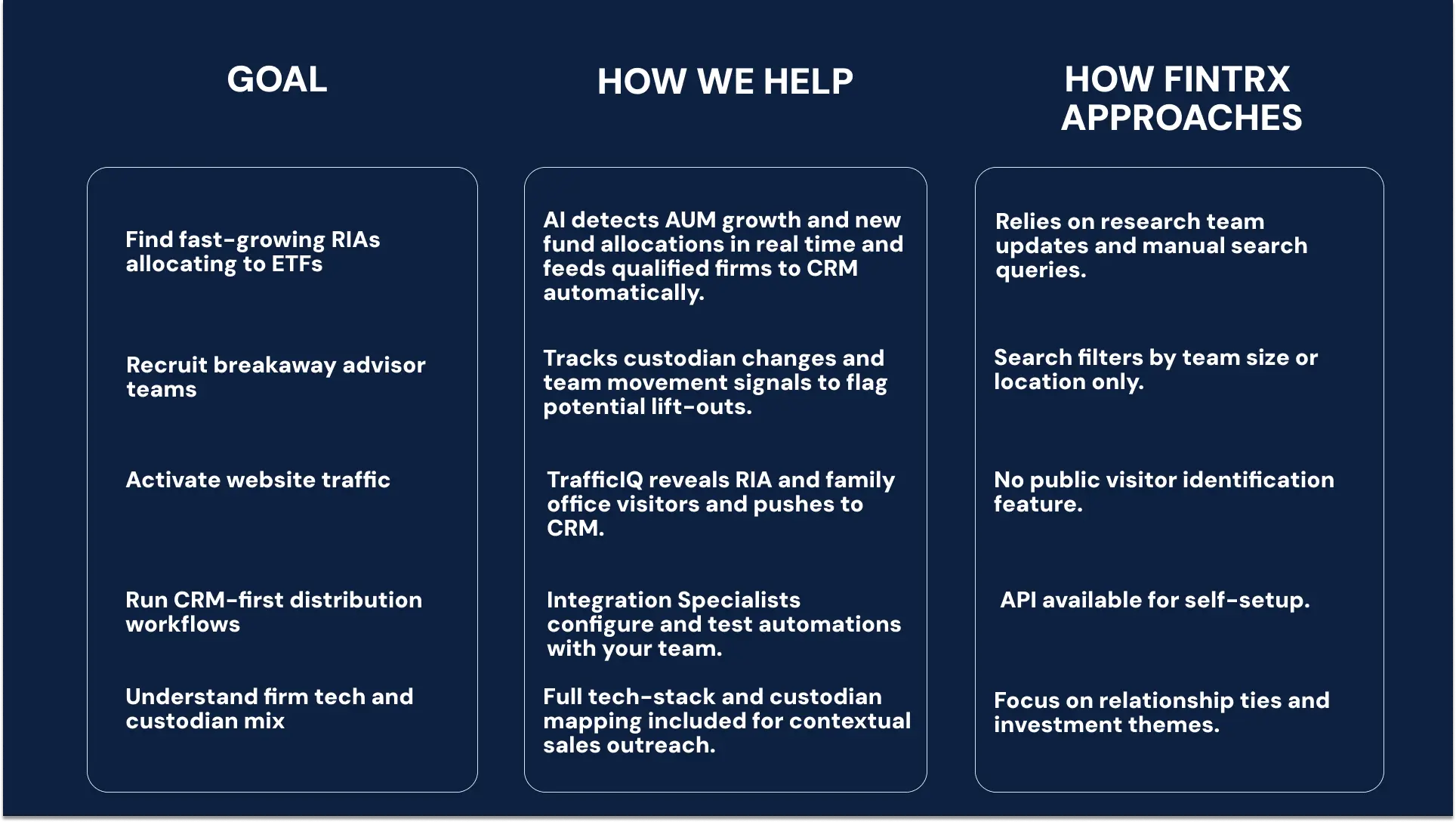 FINTRX offers CRM and API connections as well, but implementation is self-managed. If your team doesn’t have dedicated ops resources, the difference in onboarding speed can be weeks.