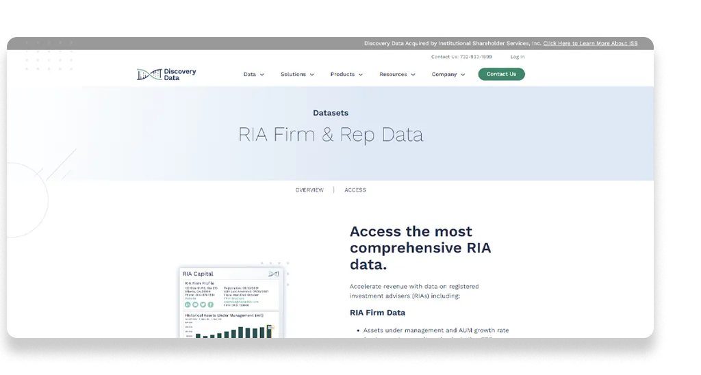 Discovery Data has long served enterprise firms seeking advisor and rep coverage across the industry. The platform includes CRM integrations and tools for enrichment and email compliance.