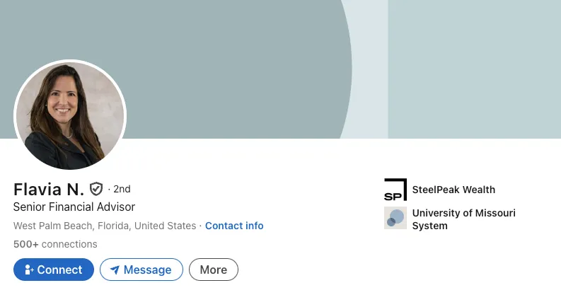 Flavia N. moved from Merrill Lynch to SteelPeak Wealth where she specializes in client relationship management and customized financial planning. Her background in wealth management and private client advisory has equipped her to help individuals and businesses meet and exceed their financial goals.