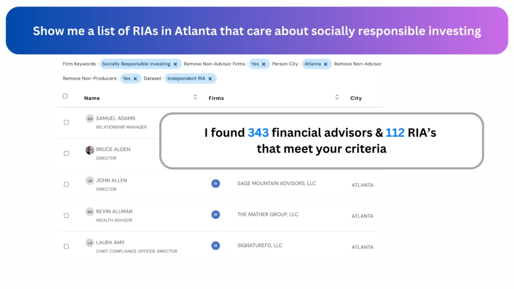 Instead of relying on manual filtering or static lists, users can ask dynamic, intent-based queries such as “RIAs managing over 500 million in Texas using Schwab and Orion” and receive results in seconds. This technology significantly improves prospect discovery and enables timely engagement in competitive markets.