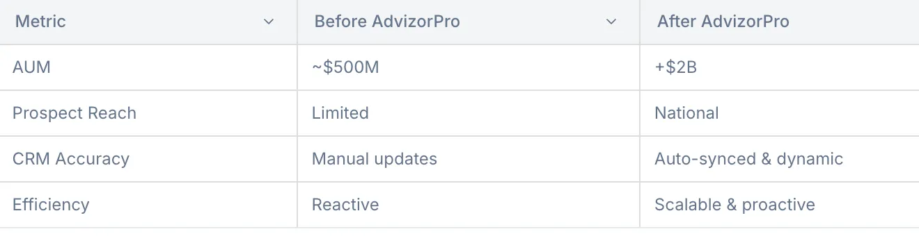 - Data that fuels action: Enriched, verified advisor intelligence ready to sync to CRM.