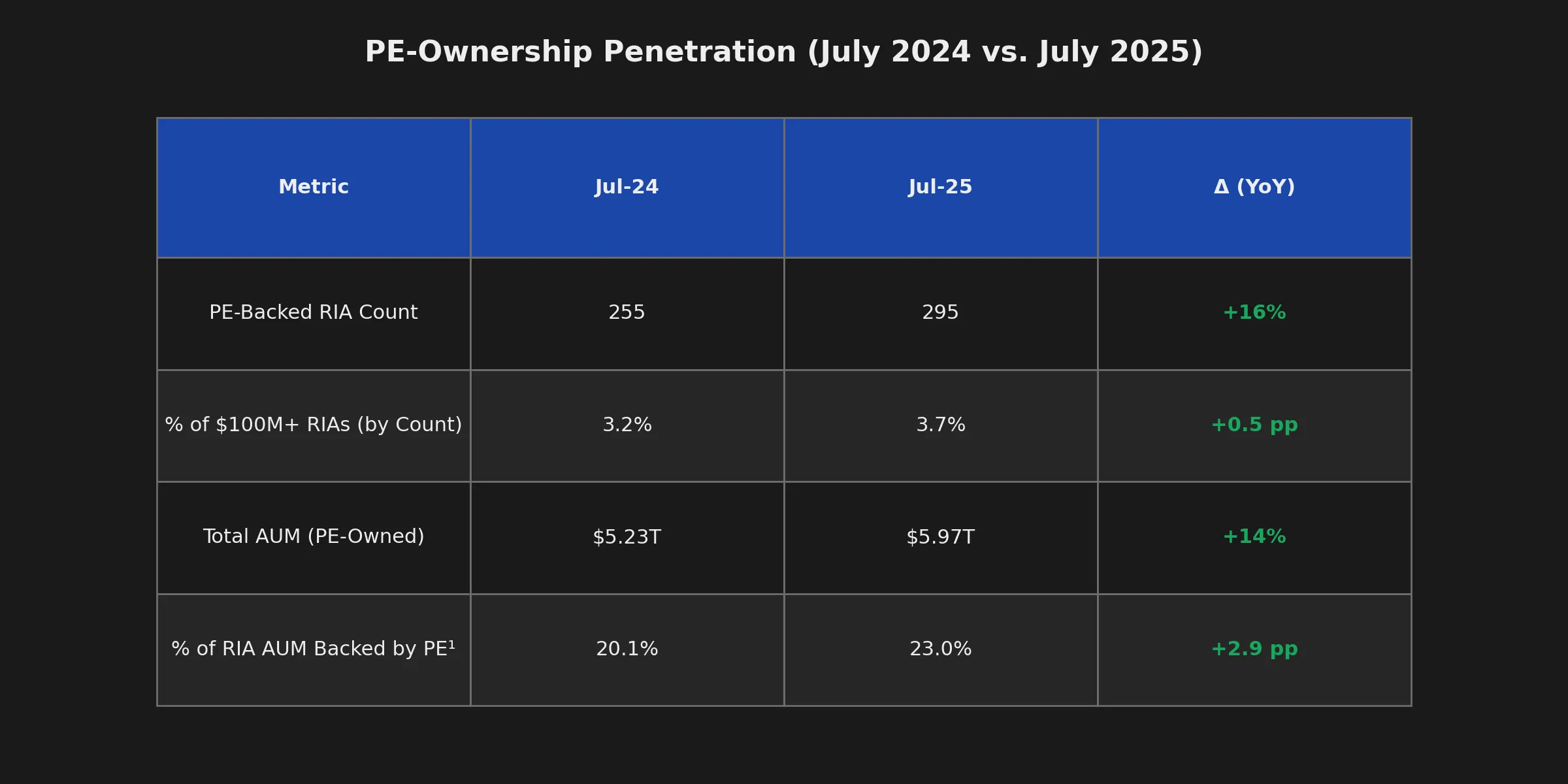 - PE-backed RIA count rose 16% year-over-year, from 255 firms in July 2024 to 295 in July 2025.