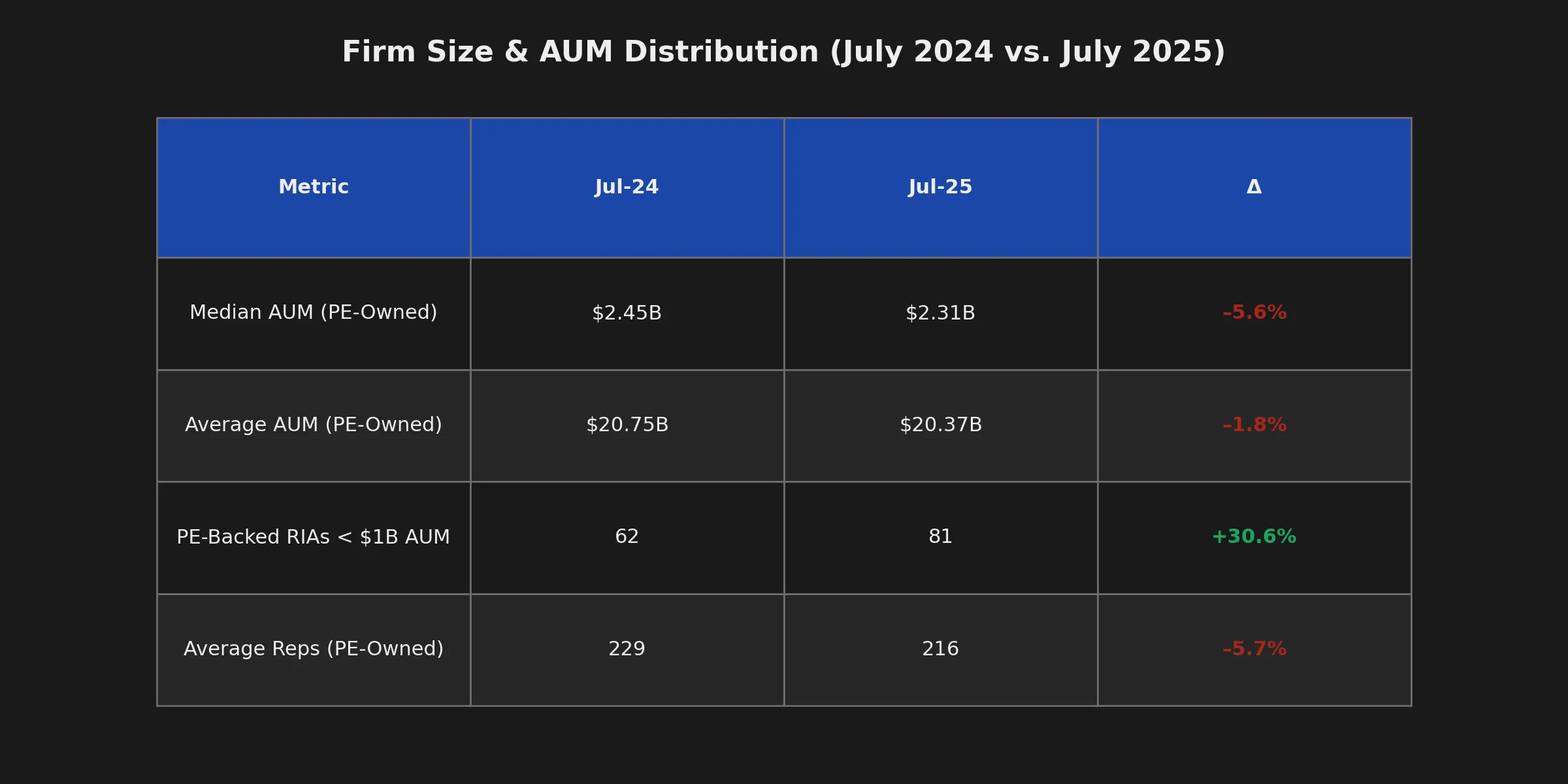 - Median AUM for PE-backed RIAs decreased slightly, down to $2.31B from $2.45B, suggesting incremental growth in mid-sized and sub-$1B platforms.