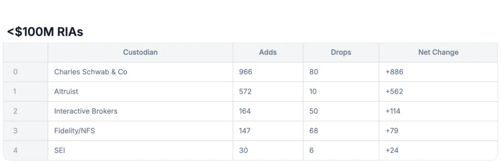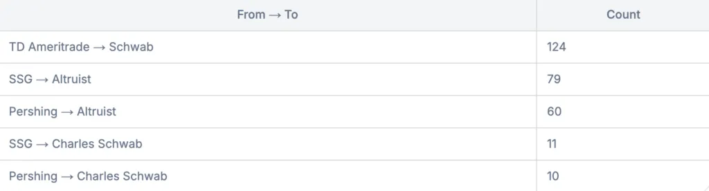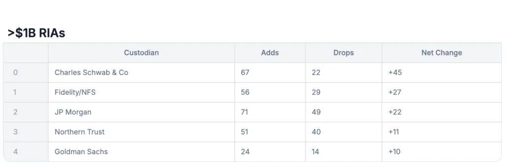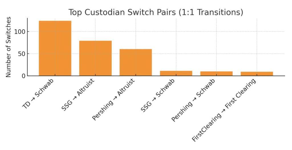 - Schwab’s consolidation: The significant number of transitions from TD Ameritrade to Schwab highlights the ongoing consolidation in the custodial space and Schwab’s strategic positioning post-acquisition.