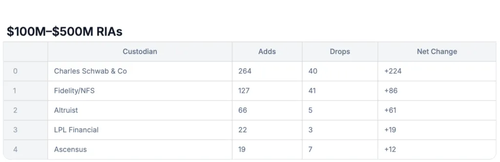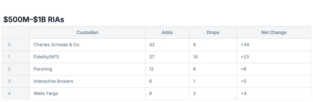 - Altruist’s Emergence in Lower Tiers: Altruist’s significant net gains in the <$500M segments underscore its growing traction among smaller and mid-sized RIAs seeking modern, cost-effective custodial solutions.