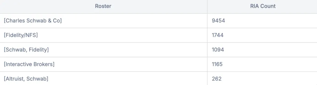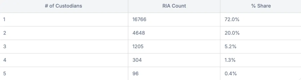- Popular pairings: The frequent combination of Schwab and Fidelity suggests that RIAs value the complementary strengths of these custodians.
