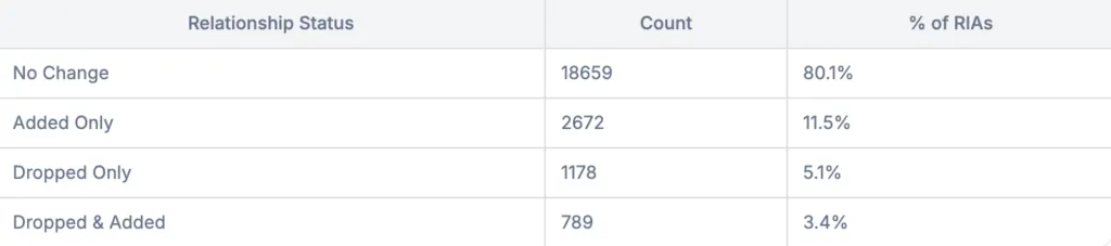 This section examines retention and switching dynamics among RIAs, breaking down how many kept, added, or dropped custodial relationships. It also surfaces the most common platform switches, offering a snapshot of competitive churn and brand consolidation.