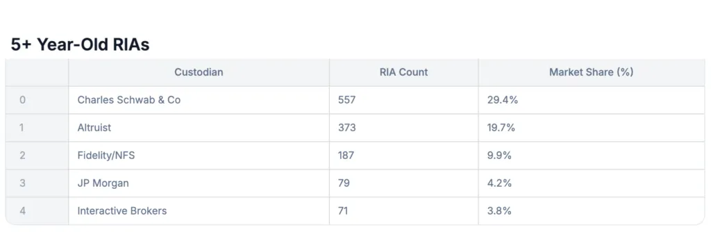 - Diverse Preferences Among Established RIAs: Older firms show a more diversified custodian usage, with traditional institutions like JP Morgan gaining visibility, reflecting legacy relationships and the need for deeper integration services.