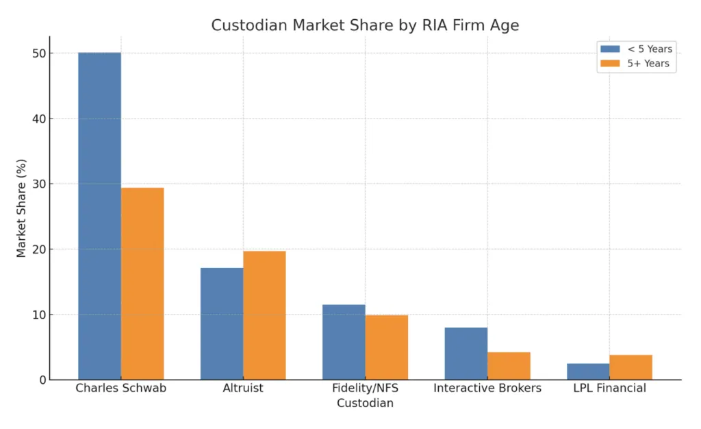 - Schwab’s Broad Appeal: Charles Schwab & Co. leads in both age cohorts, proving its strong brand recognition and deep ecosystem that resonate with both new and established RIAs.